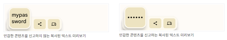 - 사용자가 민감한 콘텐츠를 클립보드에 복사할 수 있도록 허용하는 앱은 플래그를 추가하여 클립보드 콘텐츠 미리 보기에서 해당 콘텐츠를 숨겨야 한다.