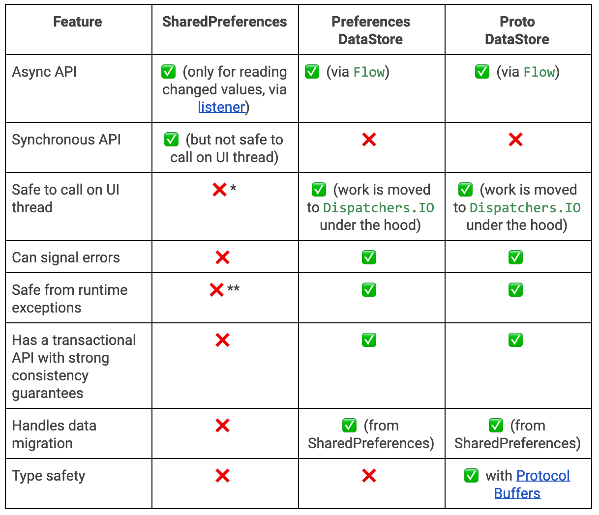 아래 표는 SharedPreferences와 DataSore의 비교표로 왜 DataStore를 사용해야 하는지 알 수 있다.