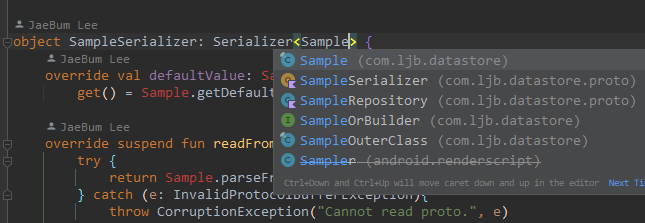 최상단에 Repository의 매개 변수 DataStore<T>에 들어갈 변수 생성, 만들어둔 SampleSerializer 지정