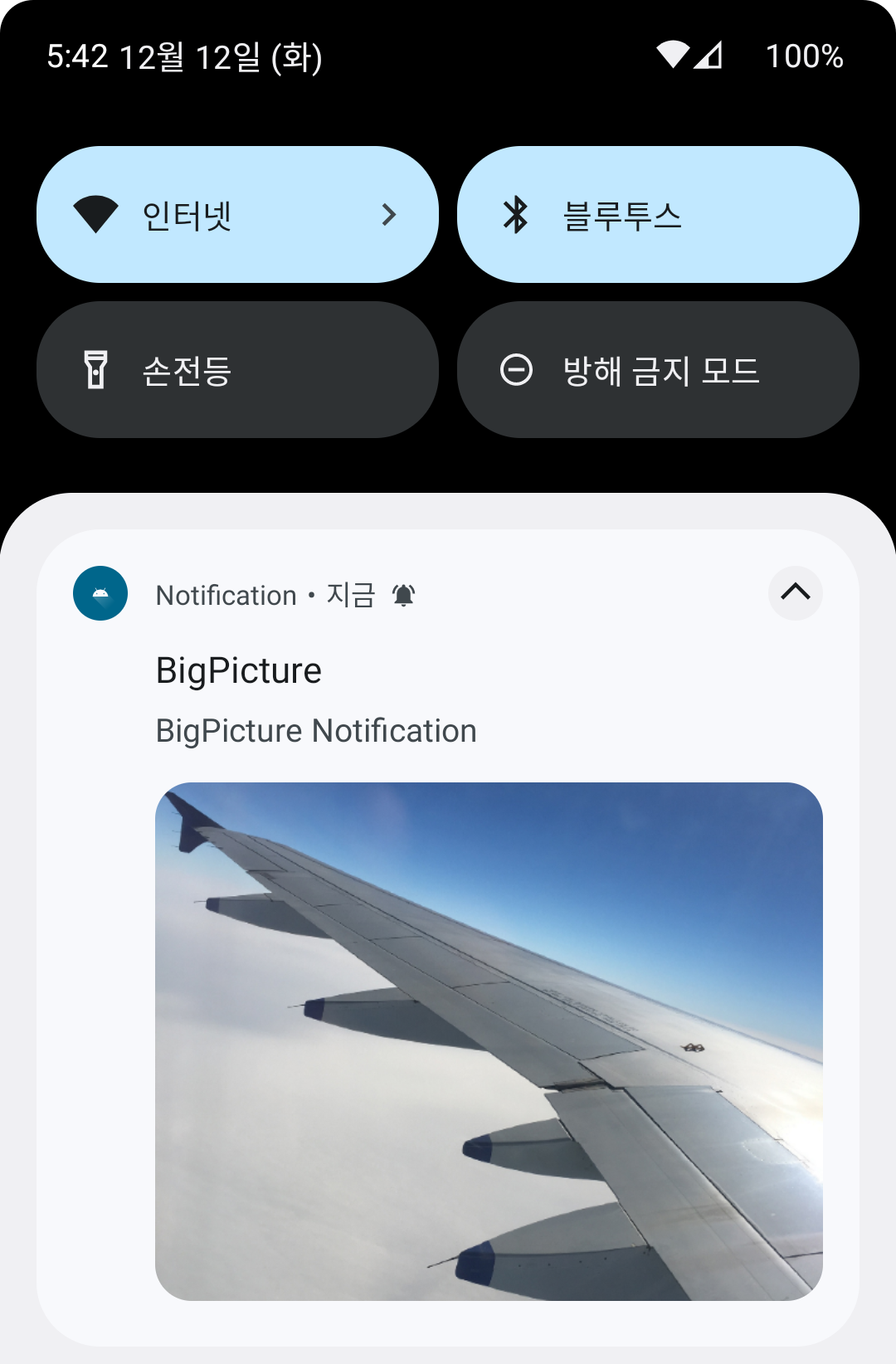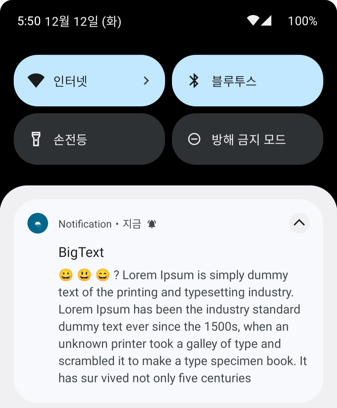 이 스타일은 SDK 24 (Android 7.0) 이상을 지원하는 기기에만 적용, 그 이하 버전에서는 NotificationCompat(호환성 라이브러리)를 통해 일반 확장형 Notification이 보인다.
