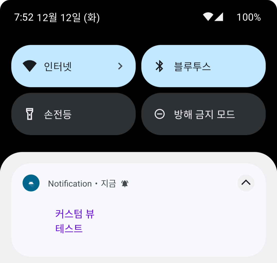 CustomView를 설정해 사용할 수 있지만 협소한 공간에 알림을 띄우는 것이기 때문에 복잡한 레이아웃 같은 Notification은 사용하기 힘들 수 있다.