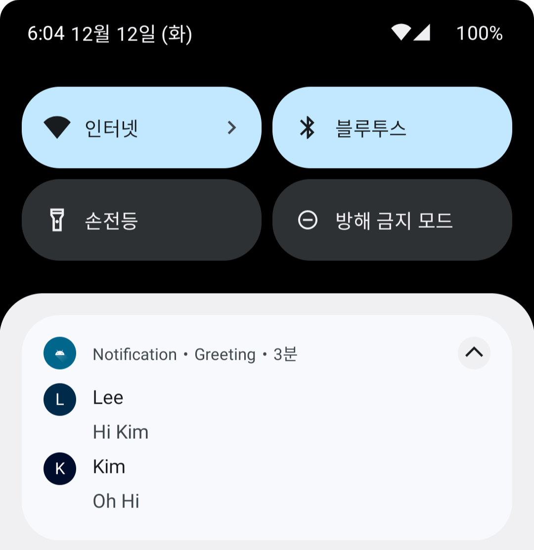 메시지는 NotificationCompat.MessagingStyle.Message를 통해 텍스트, 시간, 보낸 사람을 표시하는 메시지 객체를 만들 수 있다.