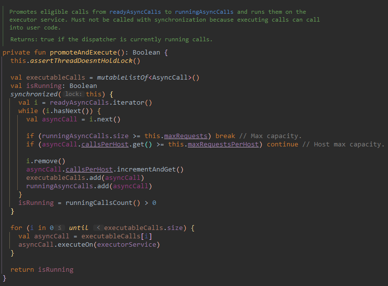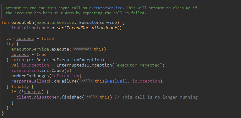 AsyncCall 클래스 내부에 promoteAndExecute 메서드는 readyAsyncCall을 runningAsyncCall로 승격시켜 주고 executeOn메서드를 통해 실행시켜 준다.