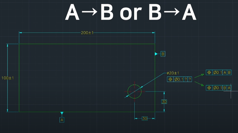 위 사진처럼 데이텀을 물리는 순서에 따라 형상(여기서는 홀)의 공차역이 달라진다.