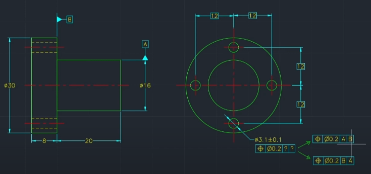 | B | A | 3.1파이 홀은 플렌지와는 수직하지만 16파이 돌출부와는 평행하지 않게 됨 |