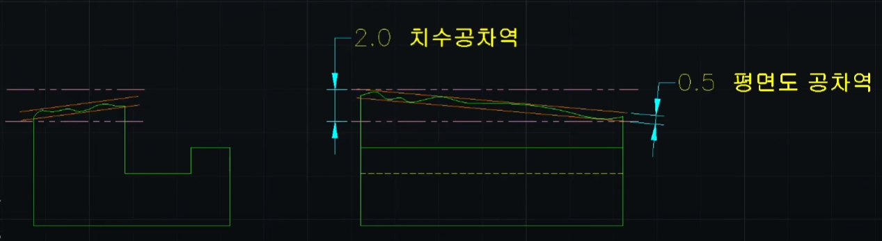 - 평면도 공차역의 크기(0.5)는 치수공차역(+-1 = 2.0) 보다 작아야 한다. (0.5 < 2.0)