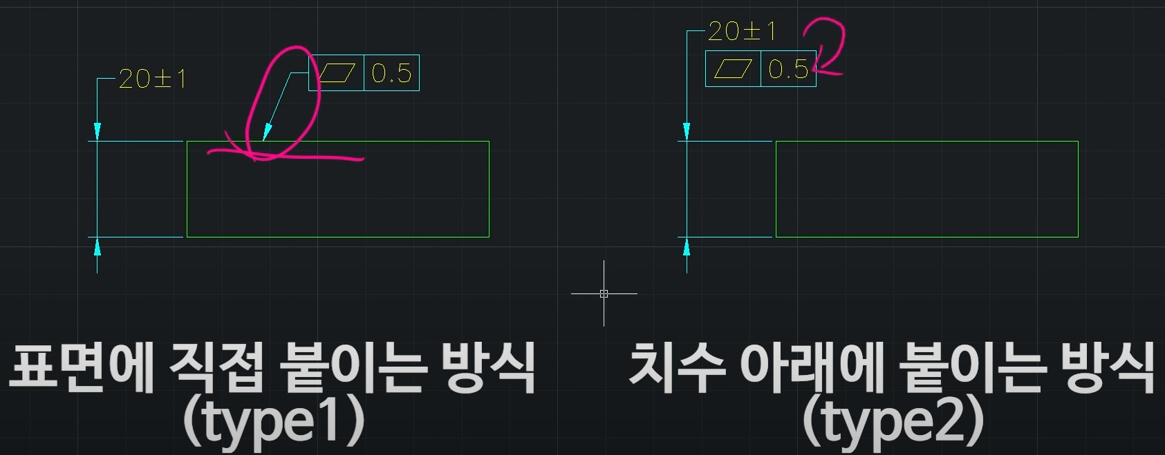 | 표면에 직접 붙이는 방식 (type1) | 가리키고 있는 표면의 편차를 0.5 이내로 관리 MMC 영역을 벗어날수 없음 |