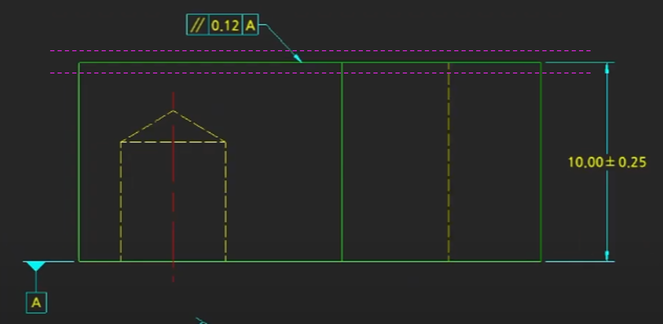 데이텀 A 면에 평행한 폭이 0.12인 두평면 사이의 공차역이 생긴다.