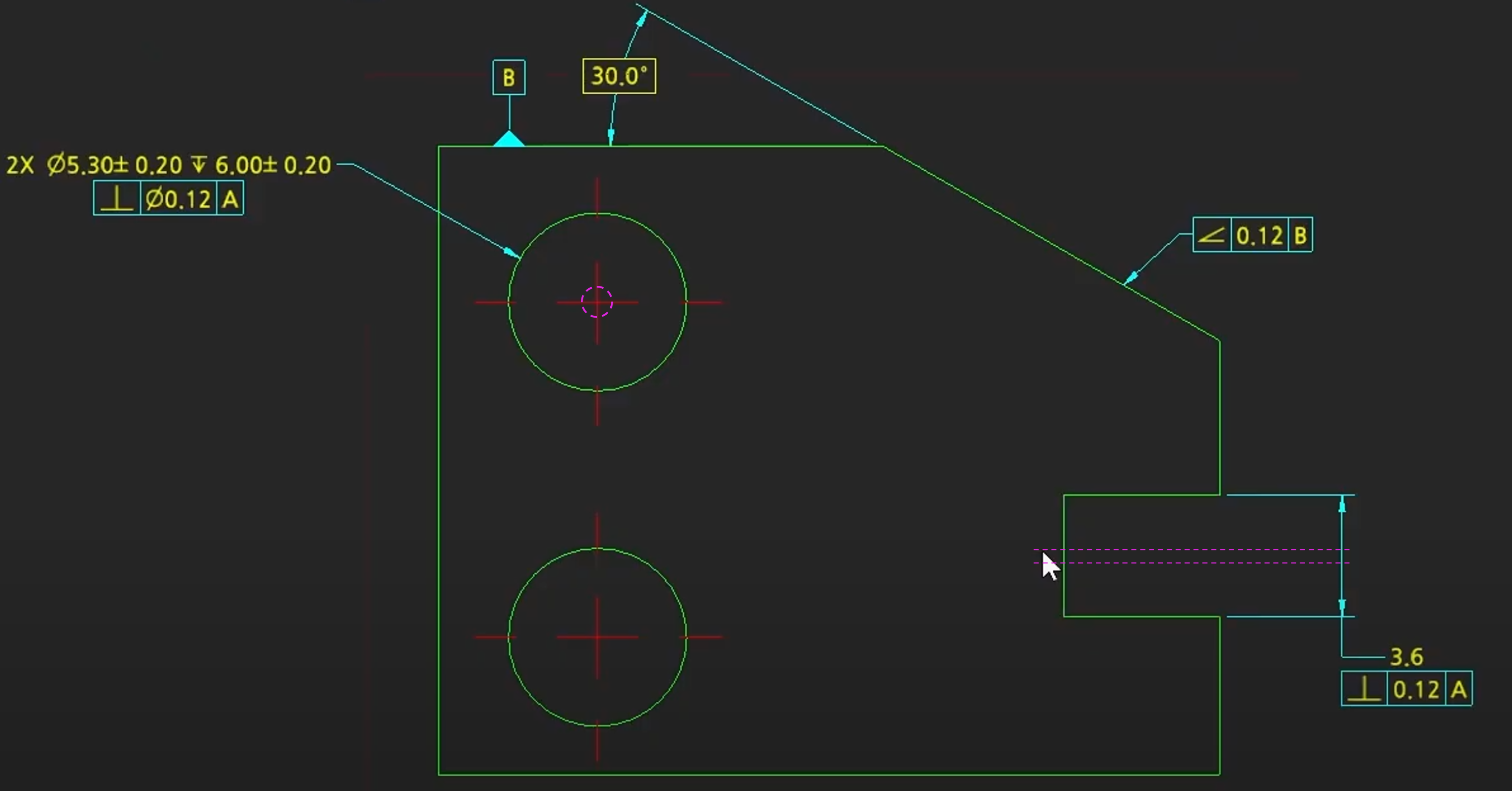 데이텀 B면의 30도 만큼 키울어진 폭 0.12의 두평면 사이의 공차역이 생긴다.