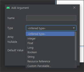 Array와 Optional(Nullable) 타입이 가능할 뿐만 아니라 enum, Parceble 값도 가능하고 기본값도 설정 가능하기 때문에 이전처럼 Bundle에 putString, putInt을 할 필요가 없음