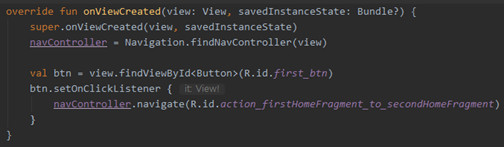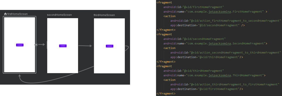 각각의 Fragment에서 버튼을 클릭할때 NavController로 지정한 action id를 이용해 navigate 하면 해당 action을 따라 화면을 이동한다.
