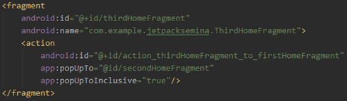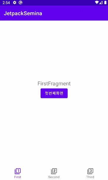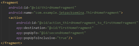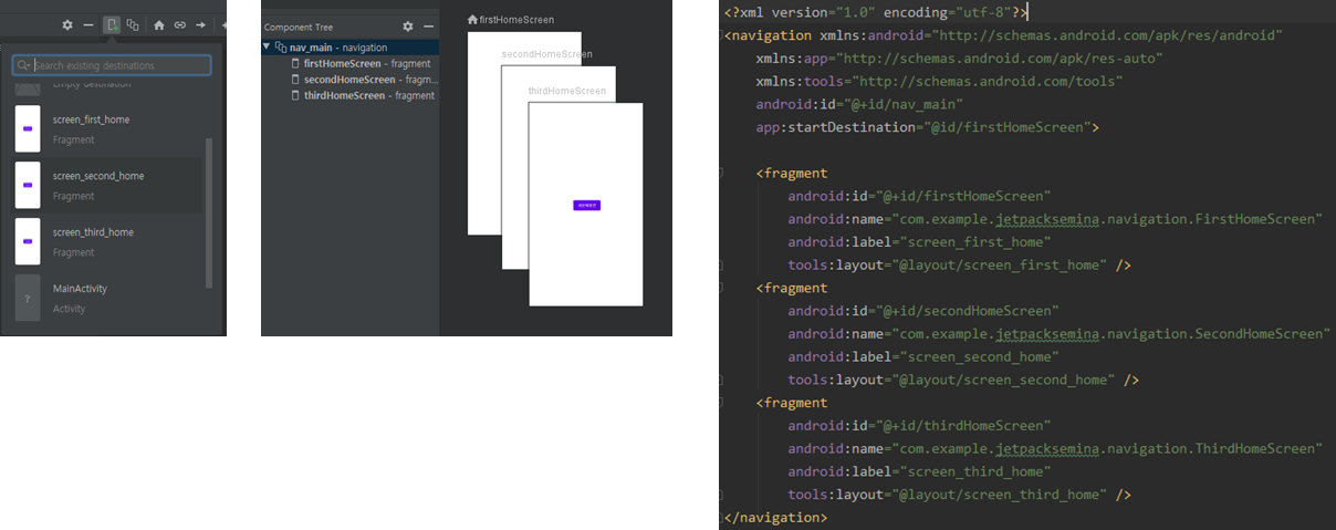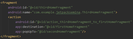 Third 프래그먼트에 버튼을 클릭하였을때 최초 First 프래그먼트로 돌아오려면 Third 프래그먼트 action에 destination을 지운 후, Second를 포함해 stack을 지우거나 app:popUpTo="@id/firstHomeFragment" 만 주어 action을 실행하면 최초 First 프래그먼트로 돌아온다