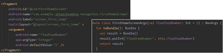 위처럼 Action이 적용되어 있다면 xml은 오른쪽과 같이 작성되어 있을 것이다. action이 가지고 있는 destination(목적지)으로 navigation이 진행된다.