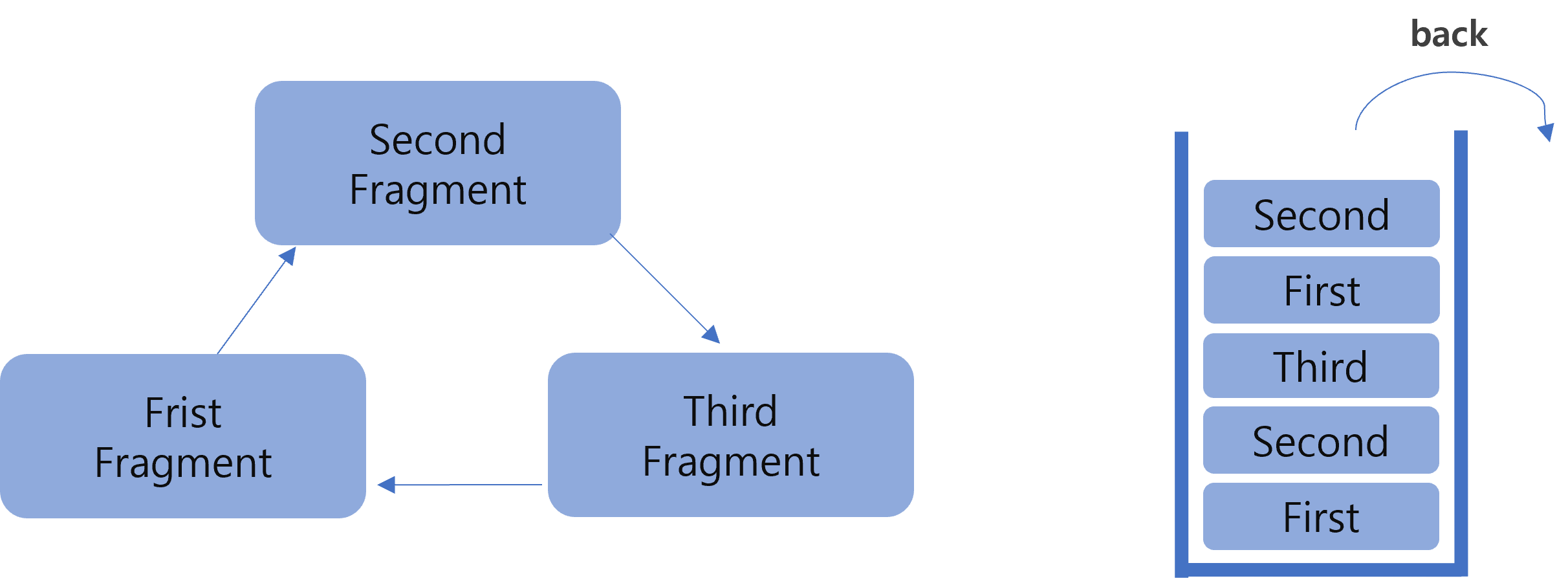 아래 코드로 실행하면 stack에 Second 프래그먼트 까지 없어진채로 실행되어 First가 쌓인다.