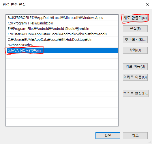 Path를 찾아 스크롤 한 뒤 '편집' 클릭 -> 새로 만들기 -> %JAVA_HOME%\bin\ 입력 하고 확인
