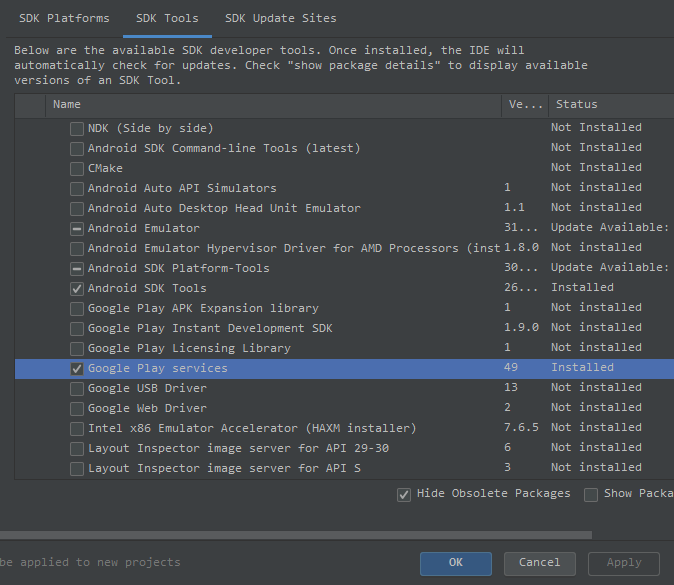 SDK Tools 탭 클릭, Google Play services 항목 체크하고 OK 클릭하여 설치 진행