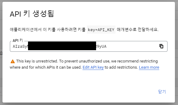 사용자 인증 정보 만들기를 클릭하여 API 키 클릭