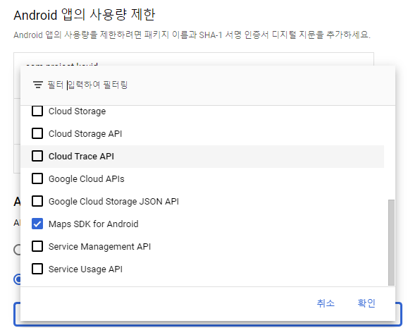 패키지와 SHA-1 지문을 넣고 API 제한사항에 키 제한 체크