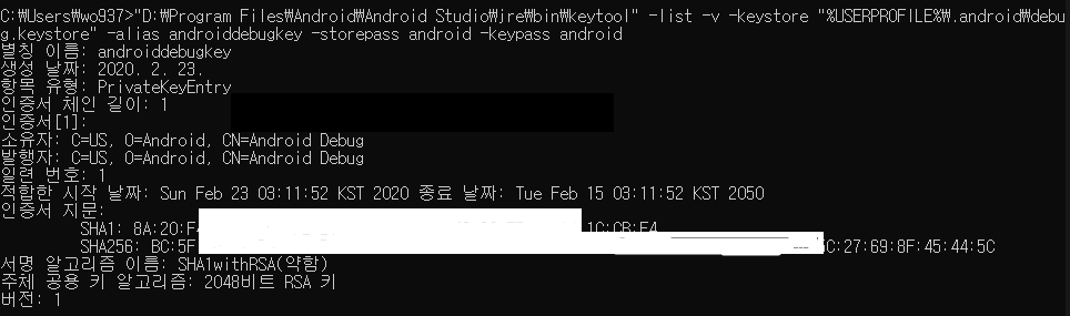 자신의 AndroidStudio 설치 경로\jre\bin\keytool 경로 값으로 아래 명령어 입력